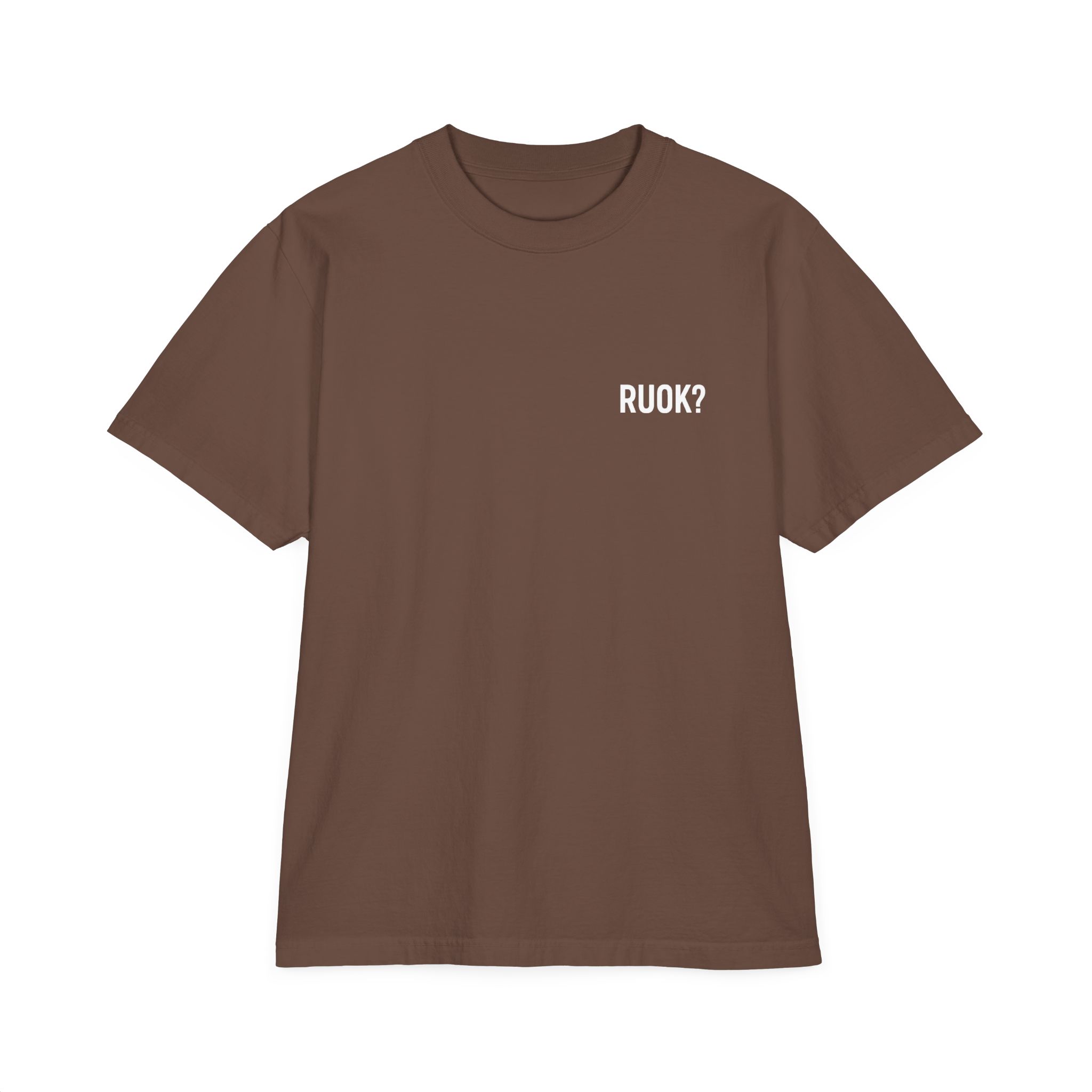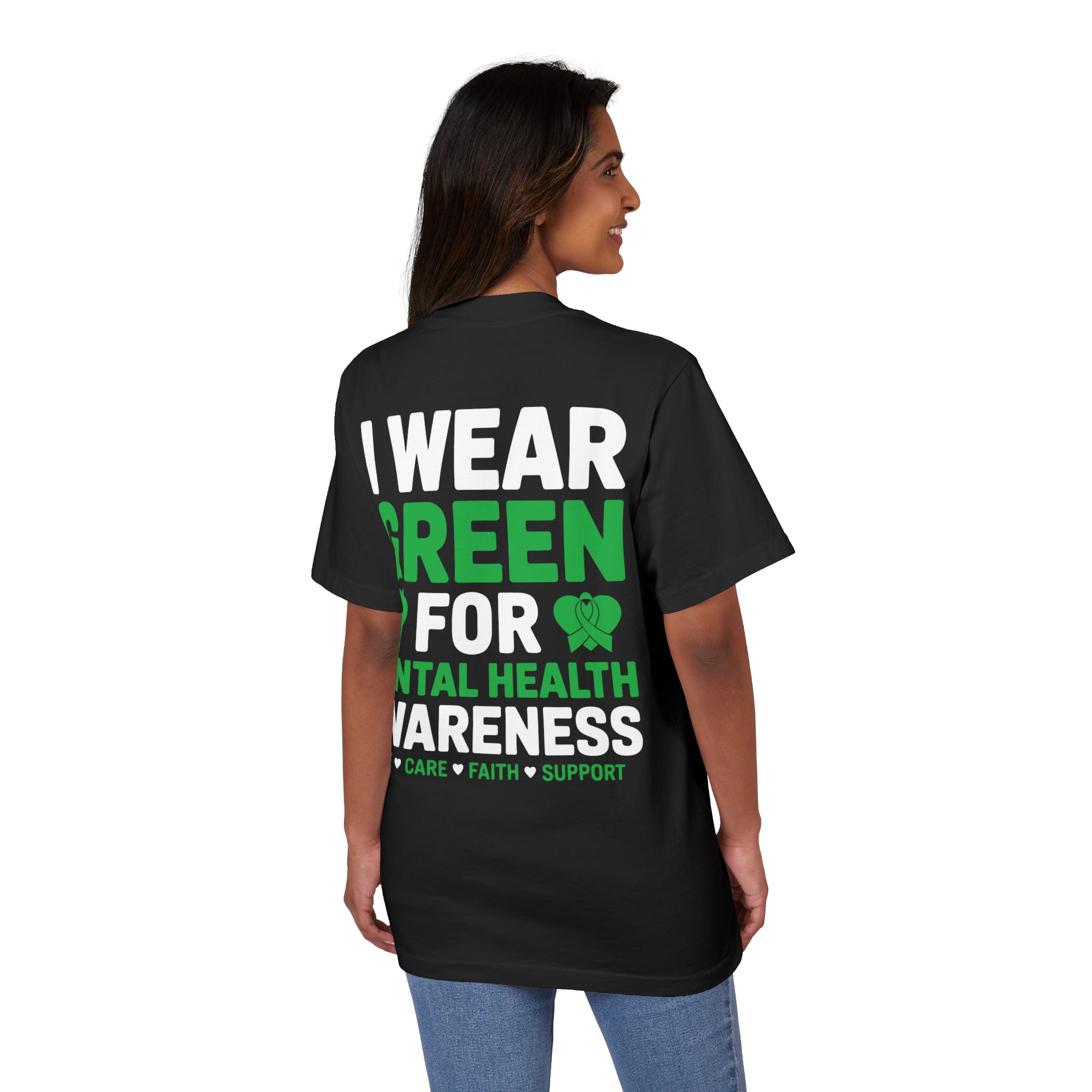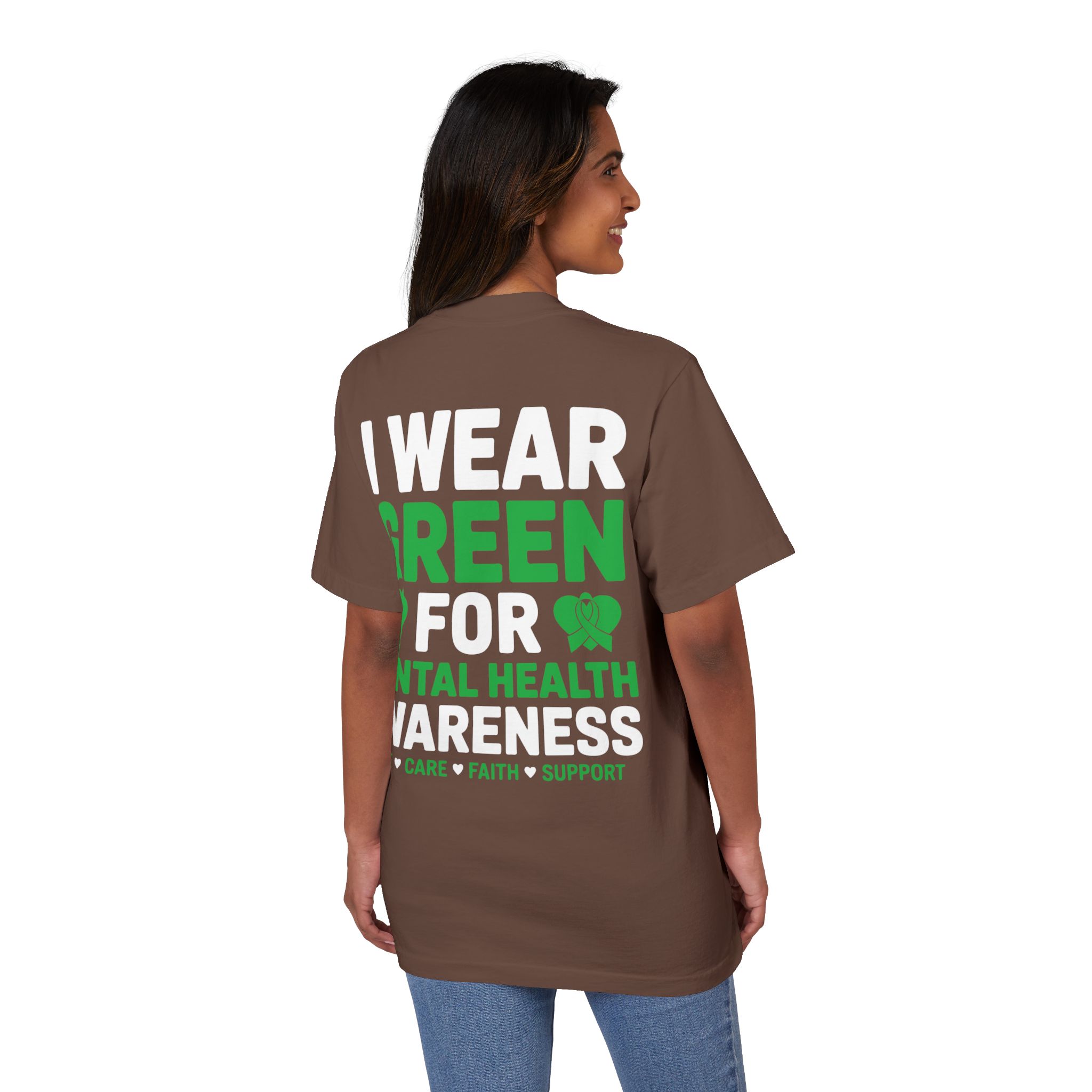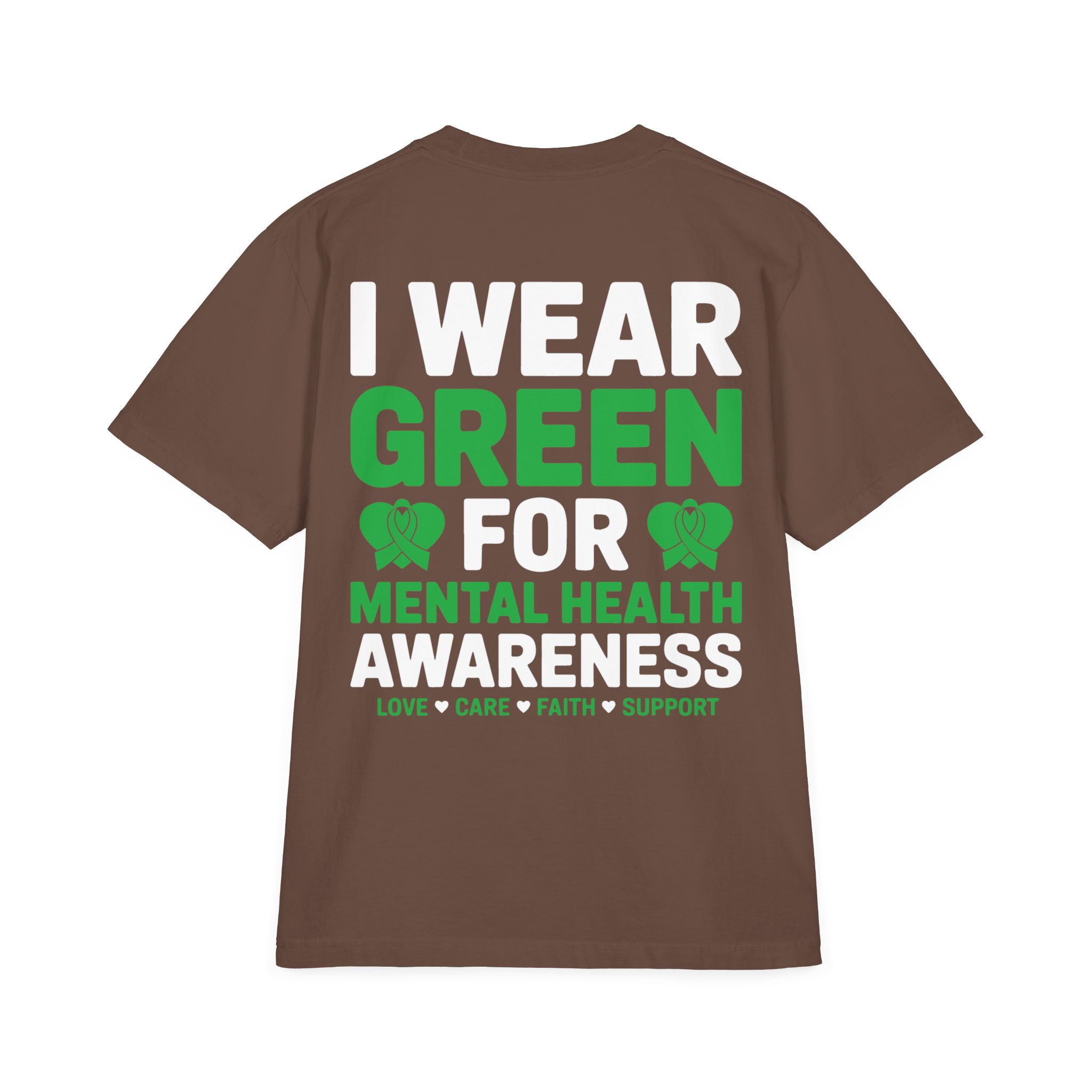 This garment-dyed drop-shoulder T-shirt carries a straightforward, heart-forward message: a bold declaration of support for mental health awareness. The soft, vintage-washed finish and slightly slouchy silhouette create an easy, lived-in feel — like a favorite tee you reach for when you want to show solidarity without saying a word. The high-contrast typographic design in bright green and white reads clearly from behind, turning everyday moments — walks, rallies, volunteer shifts, or quiet coffee shop afternoons — into gentle acts of visible support. It layers well under jackets or wears alone, and the tear-away label keeps the neck comfortable for all-day wear. This shirt is for people who want their values to be visible: compassionate, steady, and direct.